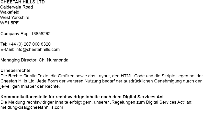 Betreiber und Veranstalter dieses Gewinnspiels ist die Cheetah HiIIs Ltd., vertreten durch den Geschäftsführer Chokchai Numnonda, Caldervale Road, Wakefield, West Yorkshire, WF1 5PF, Großbritannien (Register Nummer 13856292), im Folgenden auch nur kurz: „Cheetah HiIIs“.